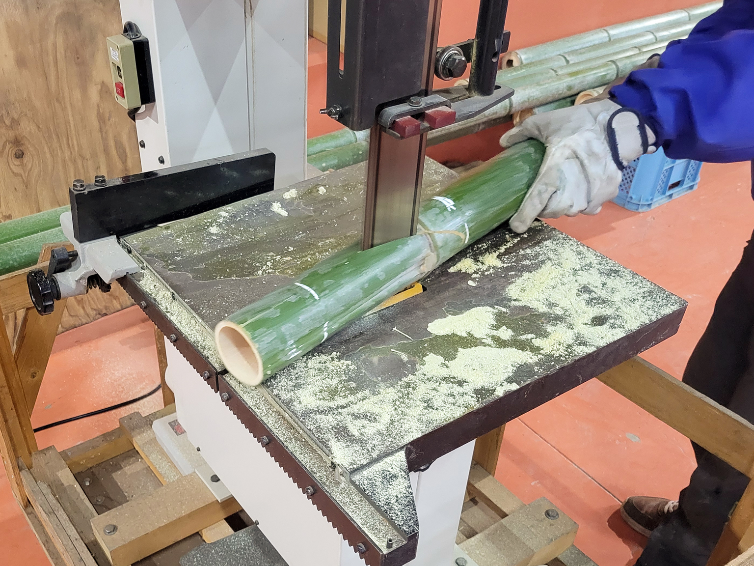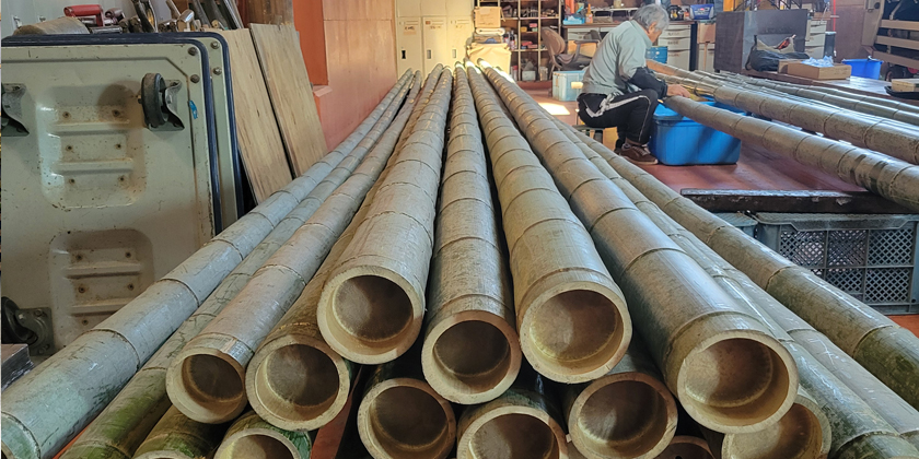 熟練の職人が、節の位置や竹の傾きを見極めながら、一本一本丁寧に切断していきます。